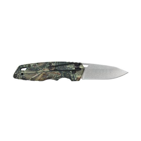 The FASTBACK Camo Folding Knife features a press and flip mechanism providing you easy, one-handed opening. The folding knife has a stainless steel drop point blade that stays sharp. The pocket knife also features a liner lock that secures the blade while allowing you to easily close it when done. The folding pocket knife has a durable belt clip that reduces pocket tearing and includes a tether-ready lanyard hole Features: Stainless steel blade Slide and flip one handed opening operation Slide lock to secure blade in place Durable wire belt clip which helps reduce pocket tearing Lanyard hole for easy tethering Include: (1) FASTBACK Folding Camo Knife [48221524]